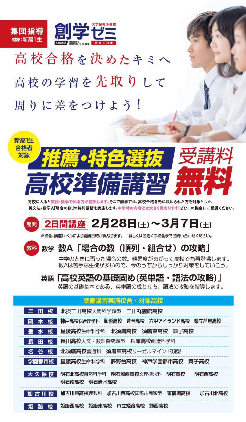 高校に入ると英語・数学で困る方が続出します。そこで創学では、高校合格を先に決められた方を対象とした、英文法・数学A「場合の数」の特別講習を実施します。