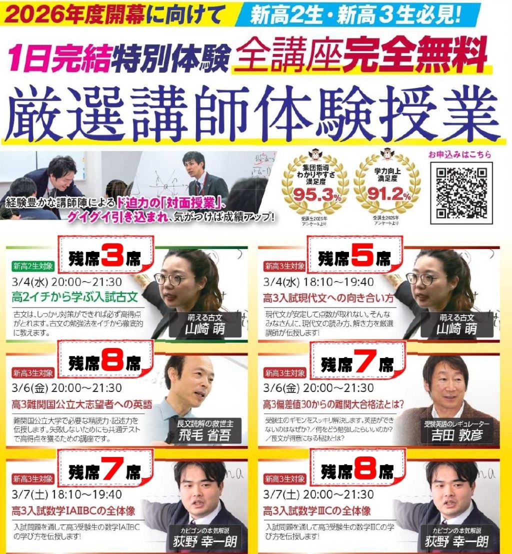 【岡本校】新高2・新高3生必見👀厳選講師による「1日完結特別体験授業」全講座無料で開催👑✨