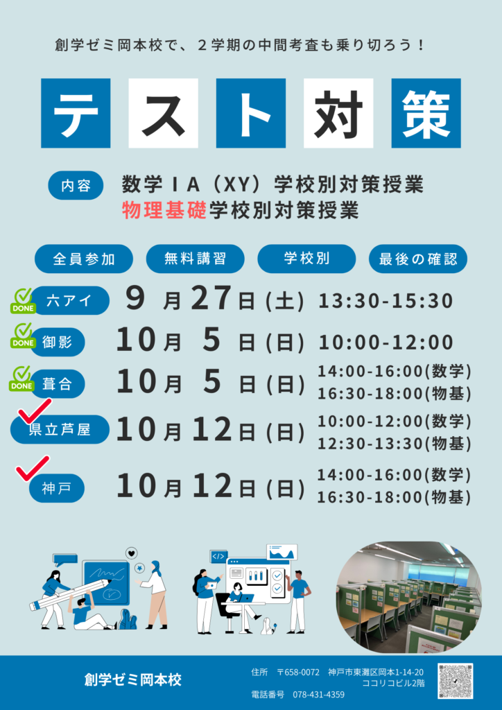 高1生:神戸&県芦対象 中間考査対策講座(数学&物理基礎)