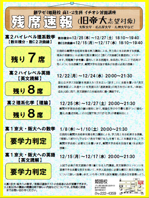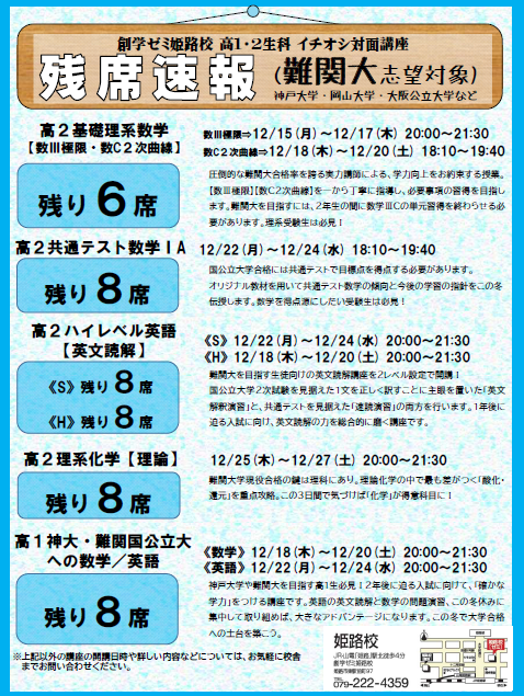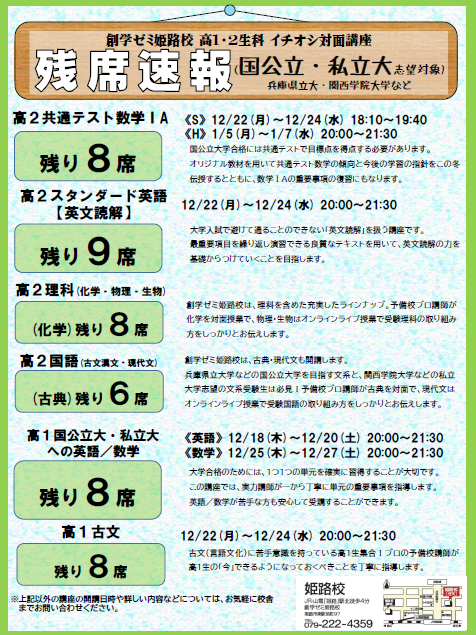 創学ゼミ姫路校では、現在、冬期入学生/講習生の受付期間中です。