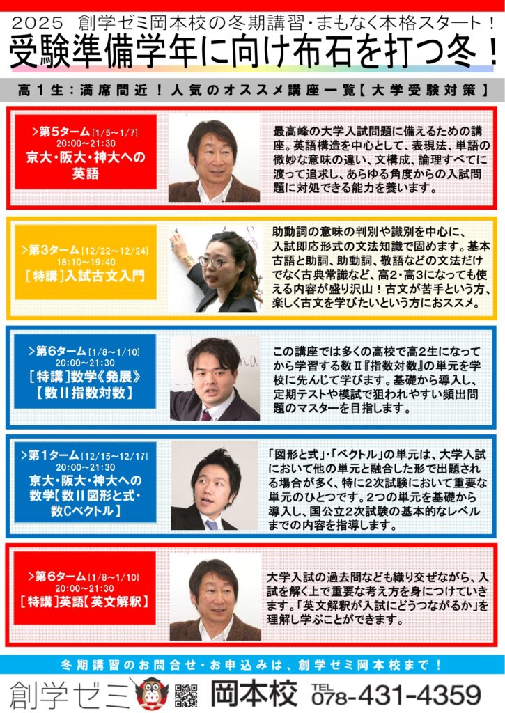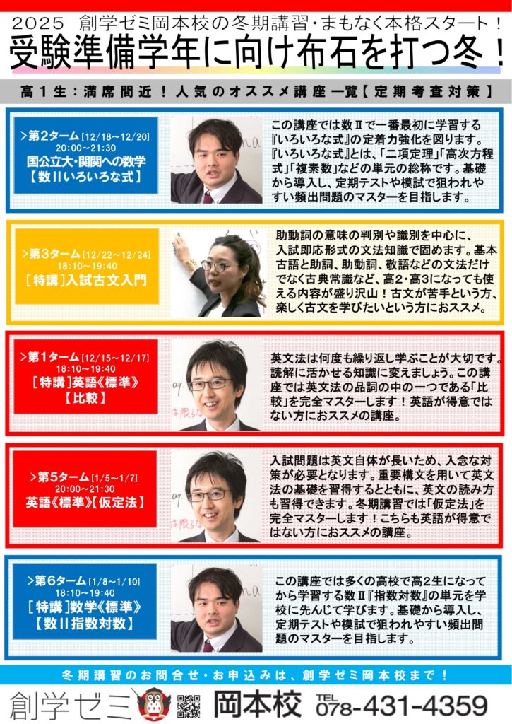【岡本校】2025高1生冬期講習おススメ講座❄《大学受験対策/定期考査対策》