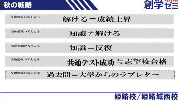 創学ゼミ姫路校では、10月13日(月)に高3生を対象にオリエンテーションを実施し、秋の戦略やここからの勉強のバランスなどについてお伝えしました。
