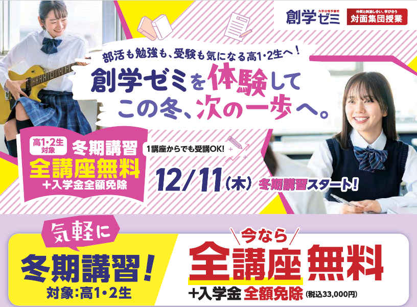 冬期講習をお申込みされた高1・2生の方は2講座無料で受講いただけるチャンスとなっております。是非ご検討ください!